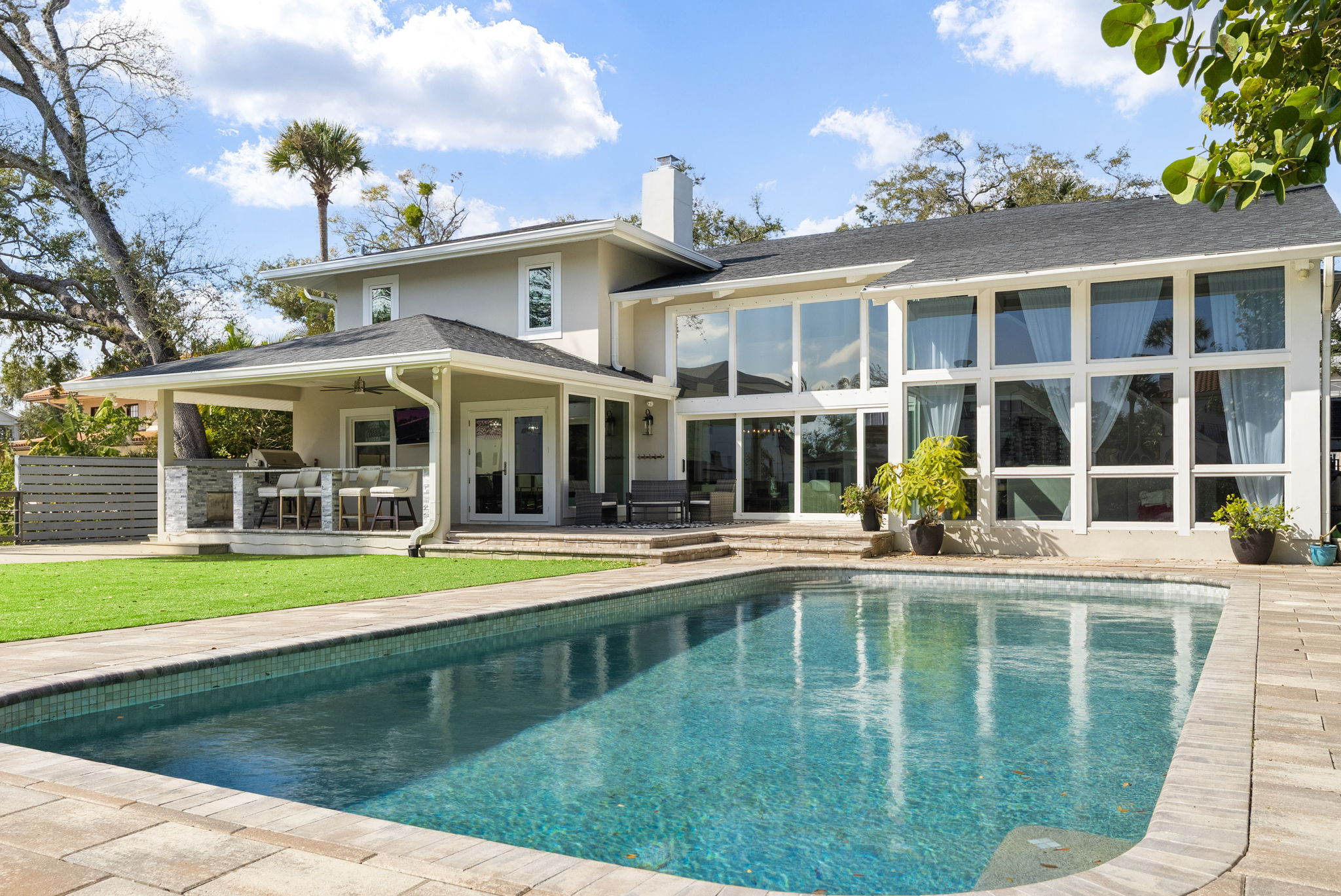 This stunning contemporary was completely TRANSFORMED in 2019 into the ideal entertaining home. The renovation included a new roof, impact rated windows, HVAC systems, plumbing and more! Tucked away beyond the circular drive on an oversized lot, this beauty does not appear to be 5,621sf, but prepare to be impressed! As you approach the double door entry, note the exterior foyer lending itself to a special welcome for visitors throughout the seasons. Upon entering, take a moment to appreciate the abundance of natural light . Your eyes will be drawn to the wall of windows with views of the expansive back yard and canal. The family room offers space to mingle. Select your favorite bottle of wine from the temperature-controlled display and play a round of pool or relax by the fire. The dining room can accommodate a large dinner party. Guests can also sit and mingle with the chef at the large island. The kitchen features solid quartz counters, a six-burner gas cook top, double oven with speed cook and convection features and ample storage including a walk-in pantry. The French doors lead to a covered patio and outdoor grill with bar seating. Or open the wall of sliders off the family room to the outdoor sitting area. This is where you will want to gather! Imagine the events you can host on the pavered patio spanning over to the sprawling 16x32 feet pool. It's the perfect place to take a dip after a day on the boat. The covered dock offers a 10,000LB BOAT LIFT and an additional DUAL JET-SKI LIFT. Another unique feature is the 528sf of added deck that is grandfathered on to the property. Back inside, past the powder bath, find a FIRST-FLOOR PRIMARY suite with two walk-in closets. The bath features a dual sink vanity, freestanding tub, and walk in shower. Upstairs features three more secondary bedrooms each with their own baths. The fifth bedroom is a sizable IN-LAW SUITE. It is connected to a spacious media room by a kitchenette. Or guests can enter via the back staircase that leads to the mudroom off the garage. Other features include a Control4 home system, an invisible pet fence, EV Charging outlet, whole house filtration and water softener system, closet shelving systems, exterior cameras, updated electrical, mosquito mist system, plumbing, HVACS, roof and more! Thanks to its location, you have easy access to Tampa International, St Pete, downtown Tampa and more! It is also zoned for A rated schools (Plant High School). There are some established neighborhoods that embody what makes south Tampa special. Sidewalks for strolling and visiting neighbors, deep canals leading to the open bay, and spacious lots with mature landscaping providing privacy and serene settings. BEACH PARK is such a place. And 5018 S THE RIVIERA is in the heart of it all!
